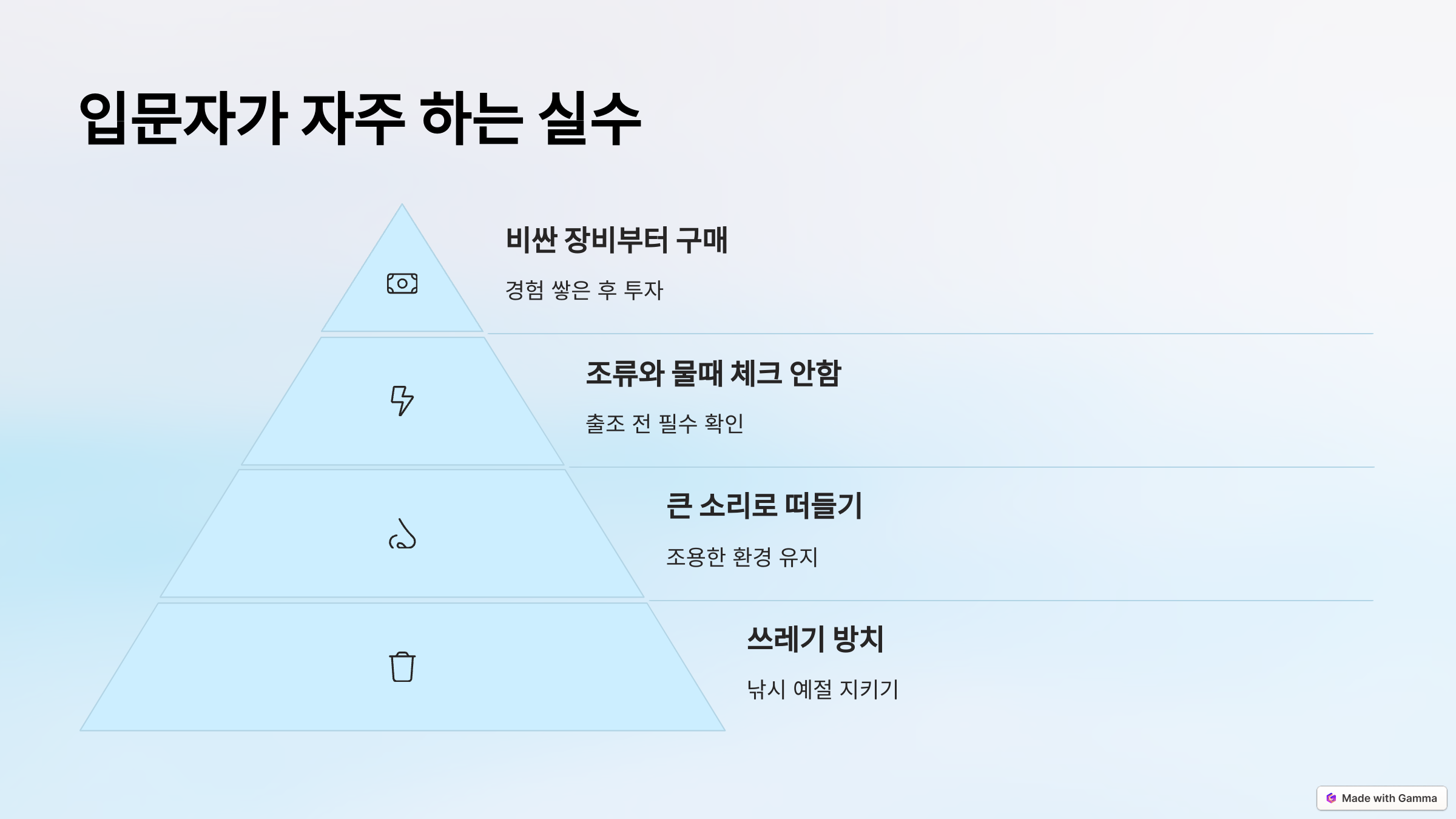 저도 처음에 엄청나게 실수했었어요. 괜히 고가 장비 샀다가 후회하기도 하고, 날씨 안 보고 나갔다가 강풍에 낚싯대 놓칠 뻔한 적도 있어요. 아래는 입문자들이 자주 저지르는 실수들이에요.