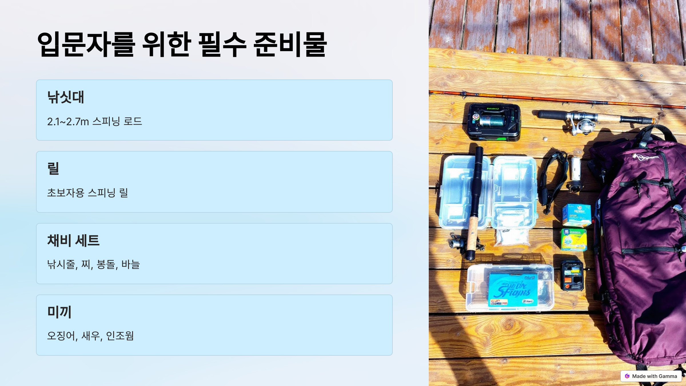 | 낚싯대 | 입문자용으로는 길이 2.1~2.7m의 스피닝 로드 추천 |
