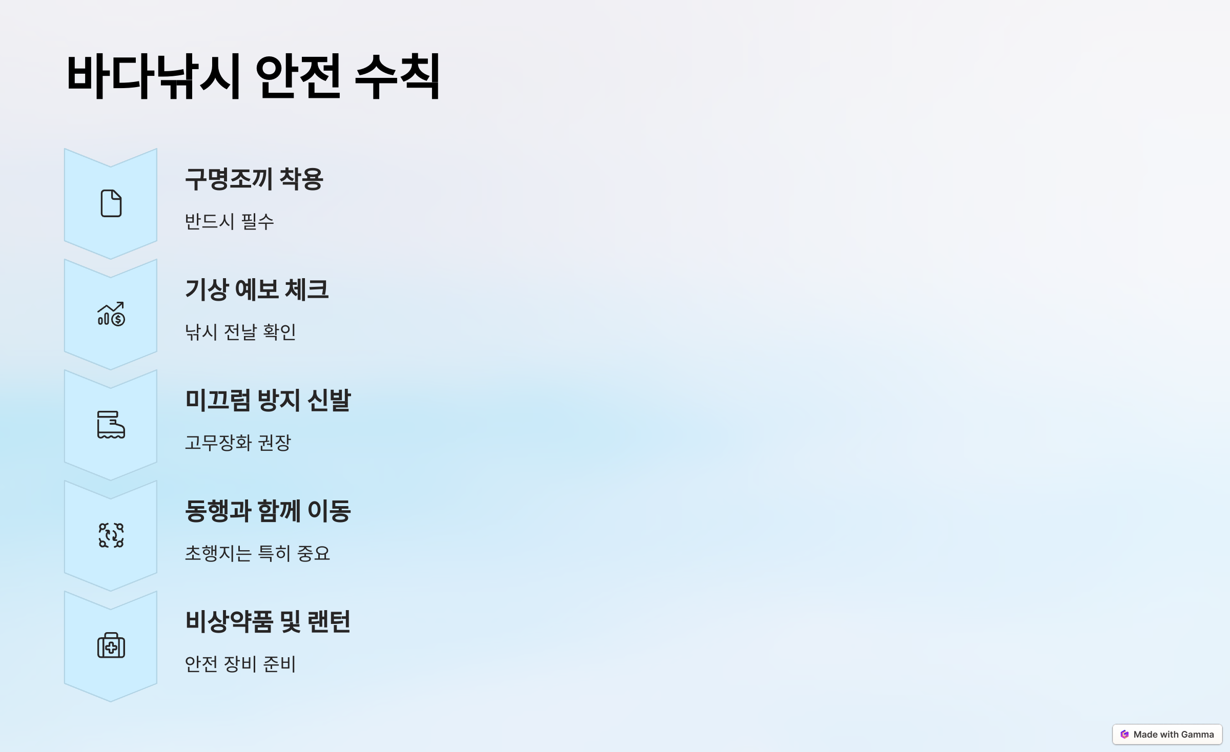 바다는 언제나 변수가 많습니다. 특히 입문자일수록 안전에 각별히 신경 써야 해요. 아래는 기본적으로 지켜야 할 안전 수칙이에요.