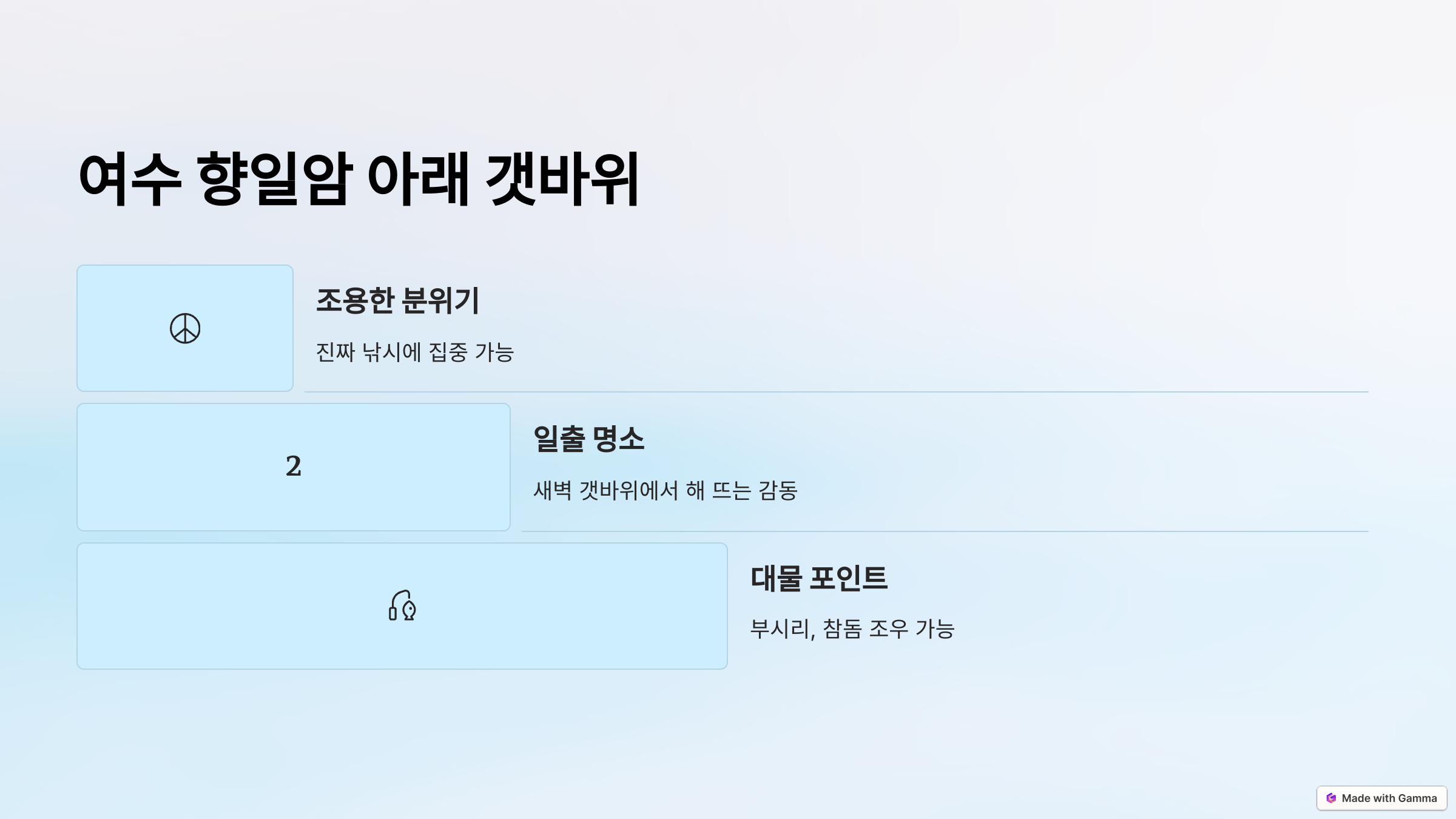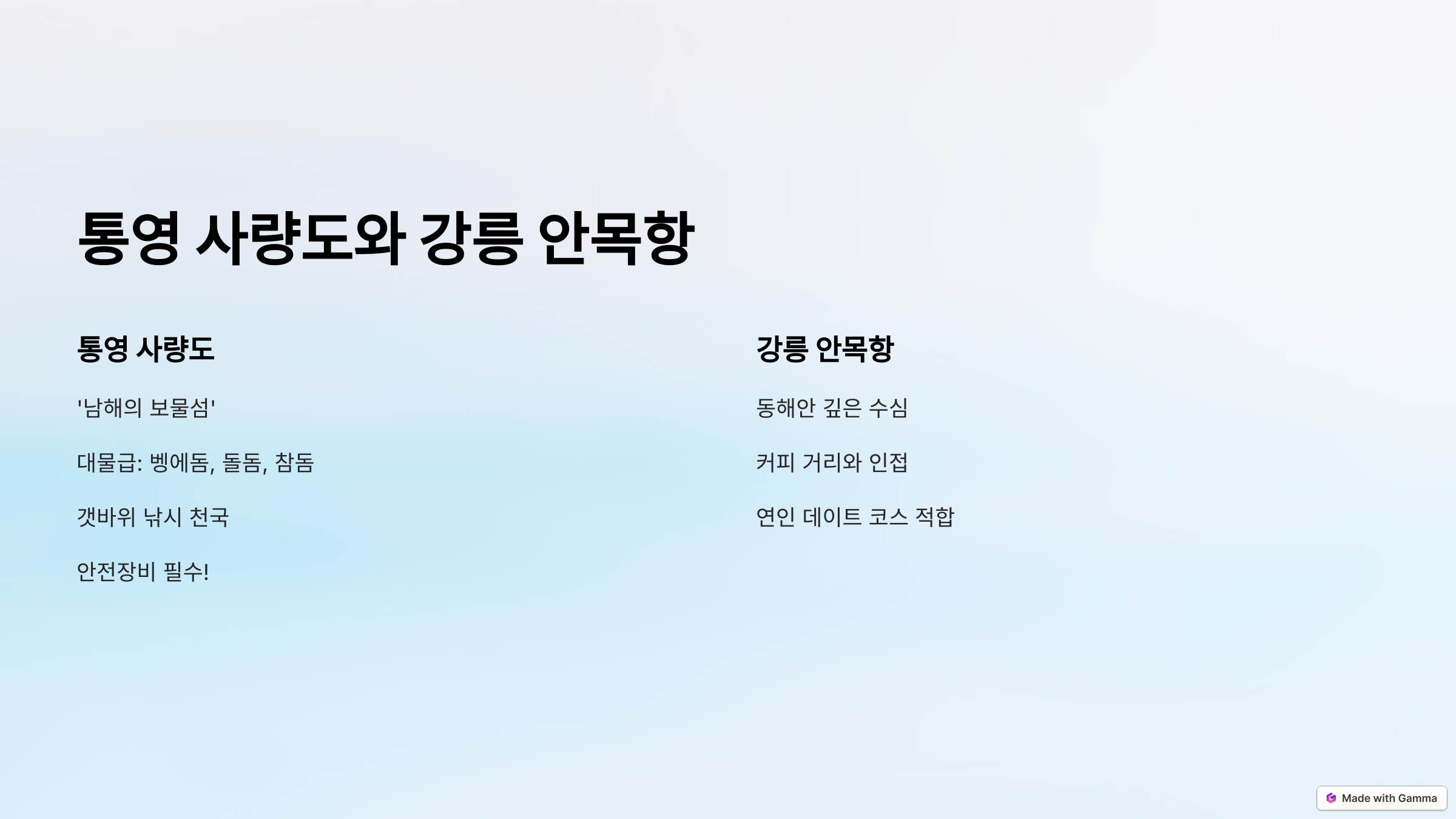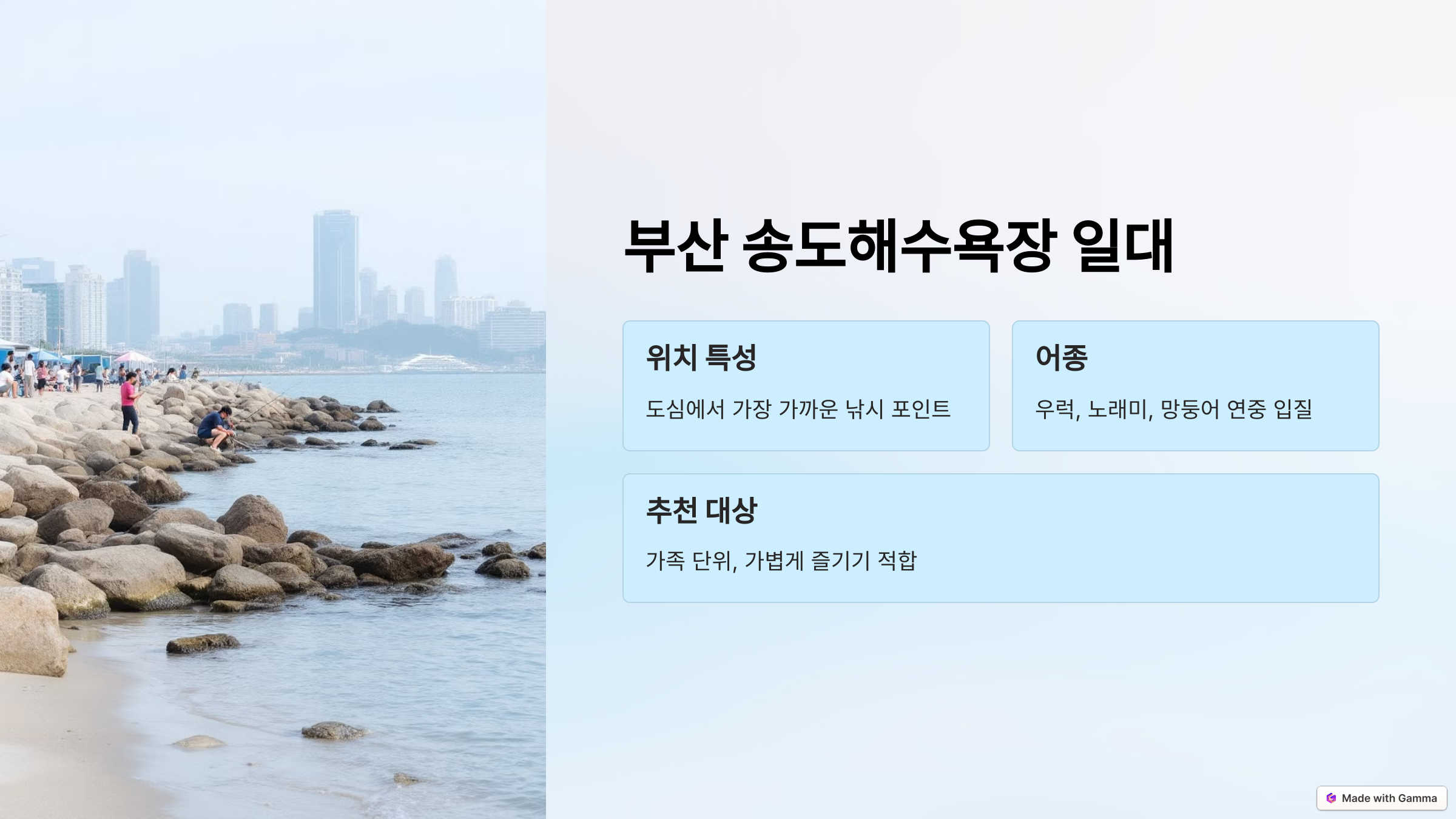 카페 거리, 맛집, 해안산책로까지 겸비한 곳이 많아요. 낚시 + 관광 코스로도 손색없습니다.