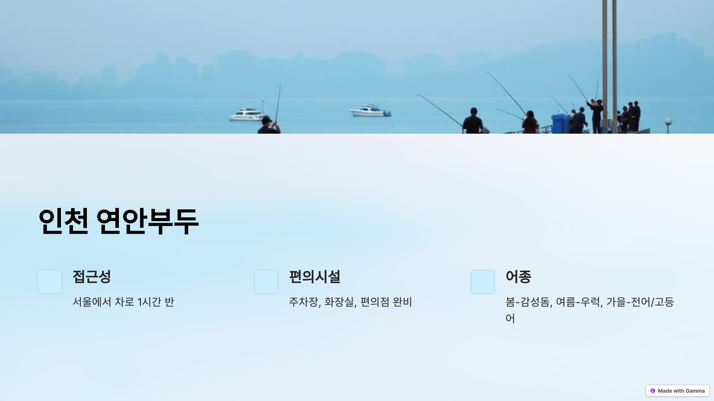 서울에서 차로 1시간 반 정도면 도착하는 인천 연안부두는 수도권 낚시인들의 성지예요. 주차장, 화장실, 편의점까지 다 있고, 초보자도 쉽게 입질을 받을 수 있는 인기 포인트들이 있죠. 봄엔 감성돔, 여름엔 우럭, 가을엔 전어와 고등어가 잘 나와요. 뭔가 낚시 외에도 구경거리 많은 분위기라 친구, 가족과 함께 나들이 겸 낚시하러 가기도 좋아요.