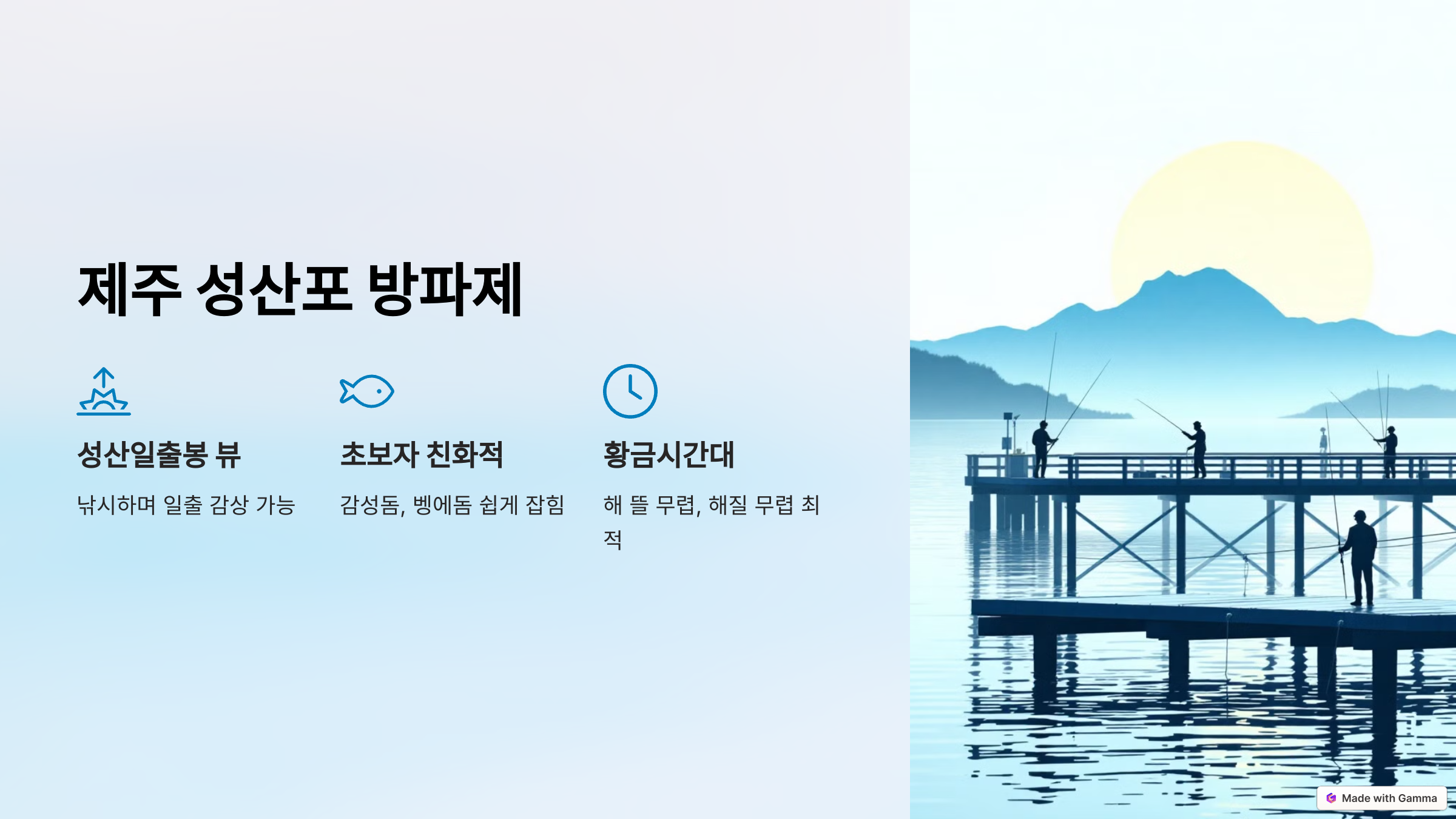 도시의 소음에서 벗어나고 싶을 때, 바다 위에 낚싯대를 드리우며 바람을 맞는 그 여유, 지금이 딱 그 타이밍이에요.