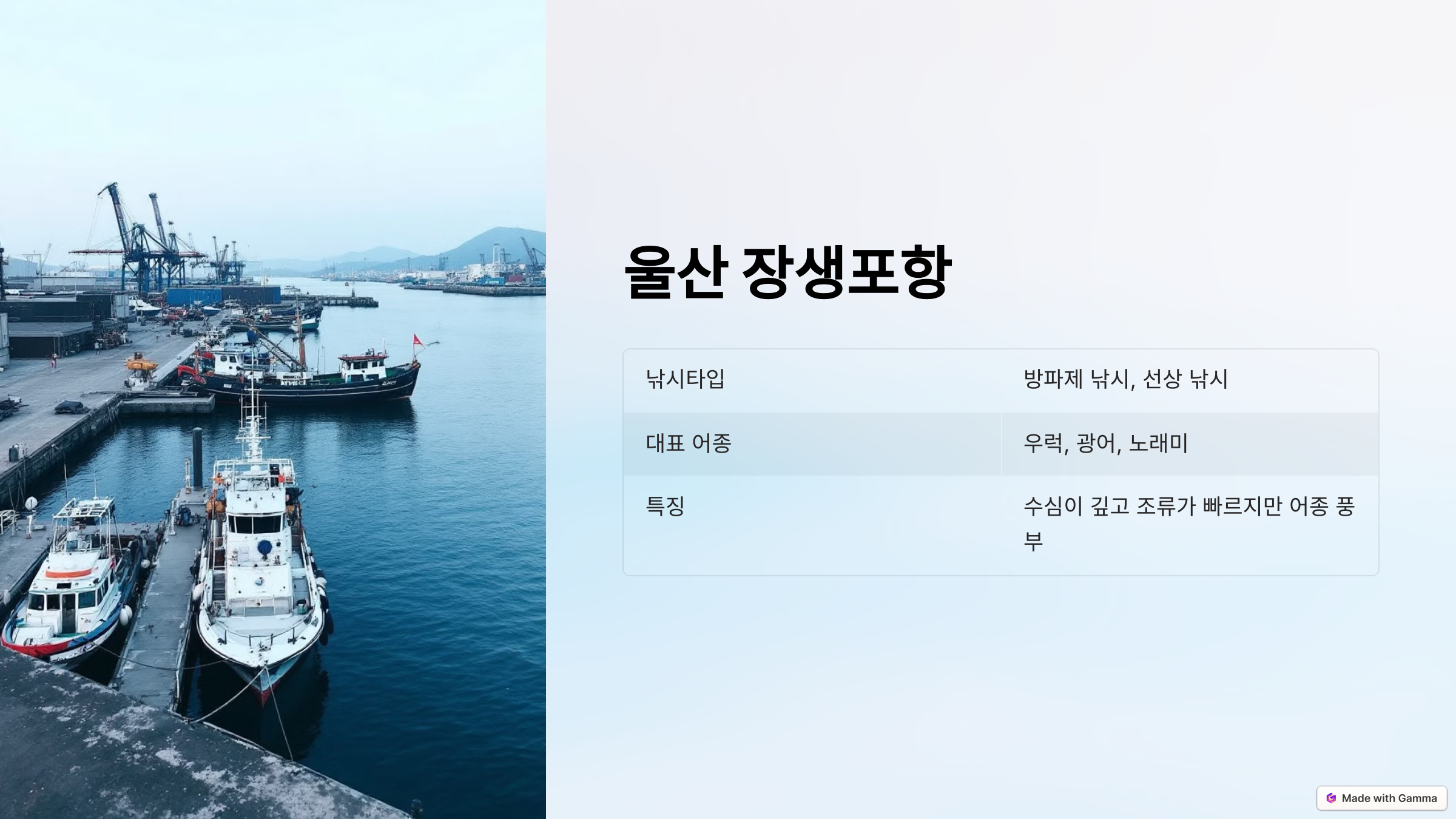 | 대표 어종 | 우럭, 광어, 노래미 |