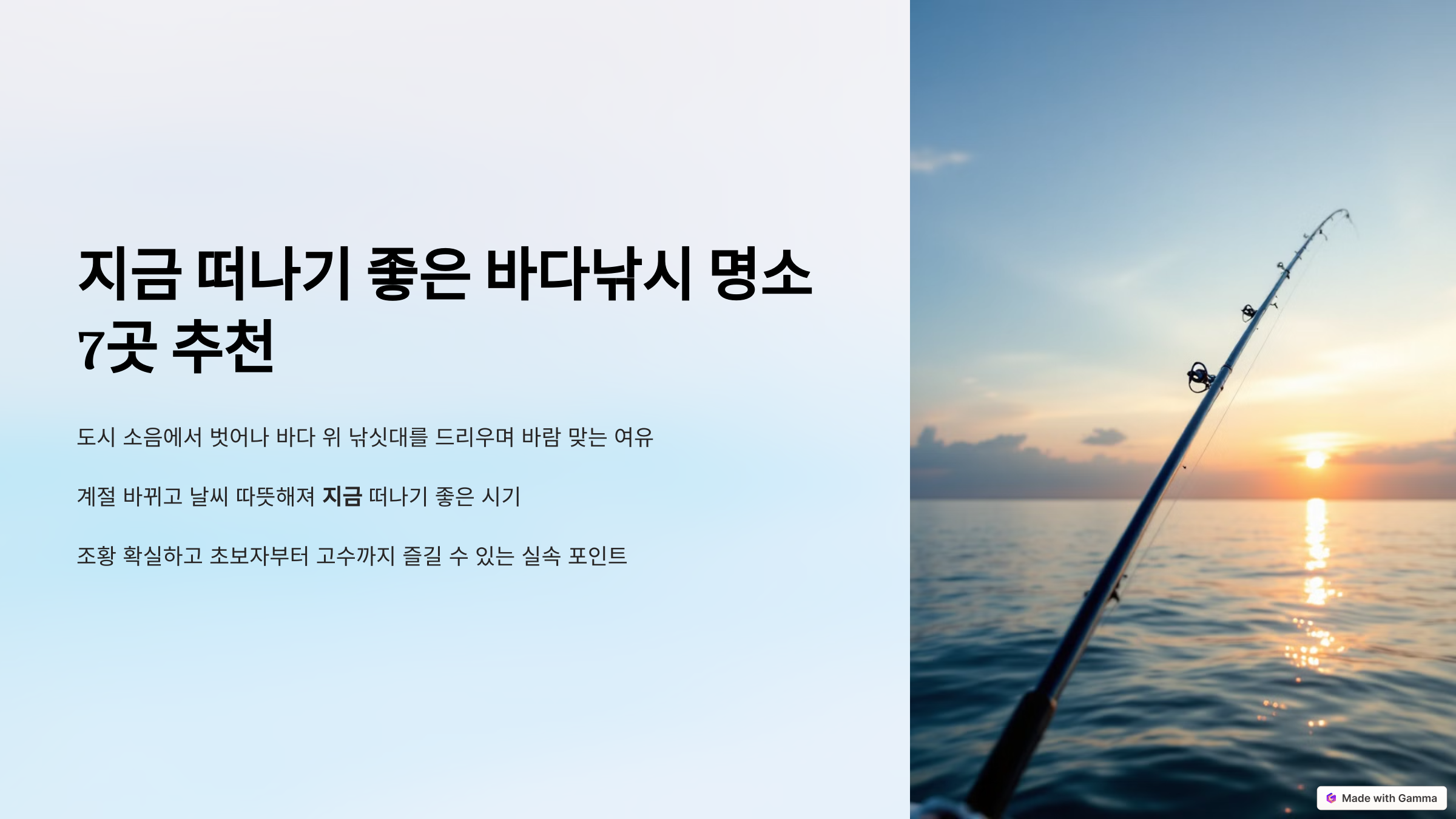 안녕하세요! 지난달 주말마다 낚시 다녀오느라 일상에 활력을 찾았던 낚시 덕후입니다. 계절이 바뀌고 날이 점점 따뜻해지니, 진짜로 “지금” 떠나기 좋은 바다낚시 명소들이 눈에 띄더라구요. 물론 그냥 풍경만 좋은 곳이 아니라, 조황도 확실하고 초보자부터 고수까지 즐길 수 있는 실속 낚시 포인트 위주로 추려봤어요. 이번 글에서는 제가 직접 가봤거나 믿을만한 낚시 커뮤니티에서 뜨거운 반응을 얻고 있는 장소들만 모아 소개해드릴게요!