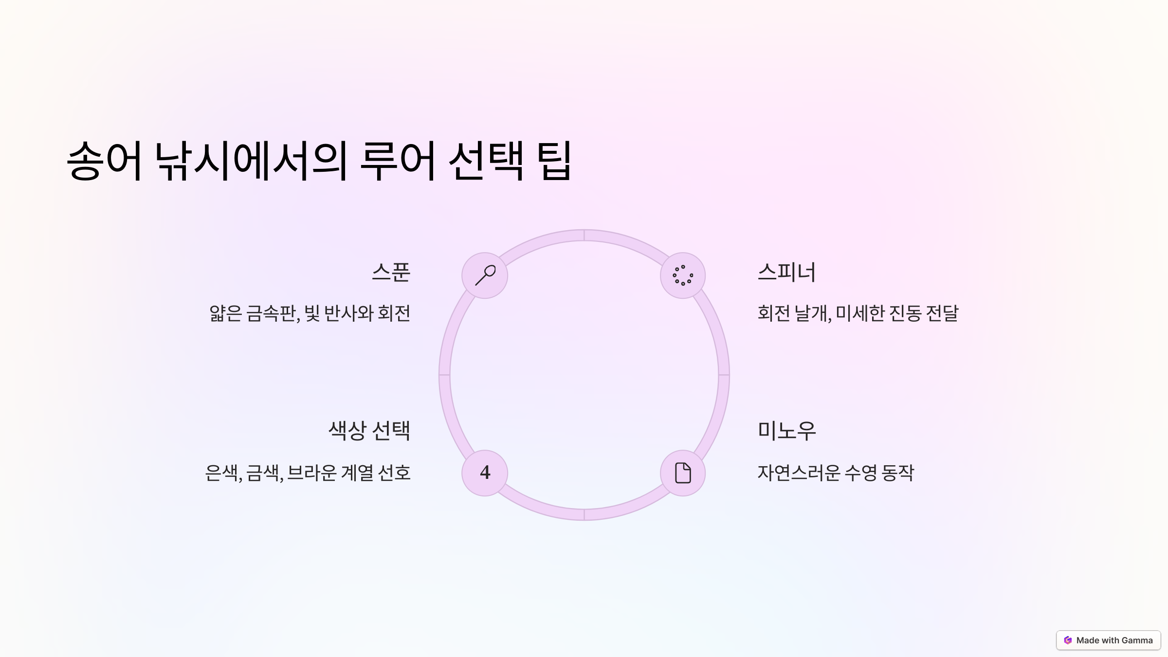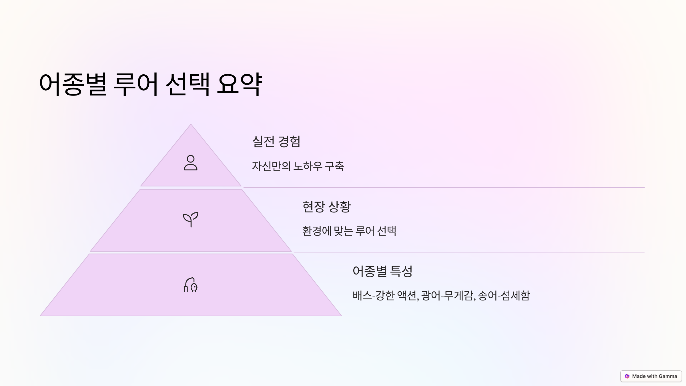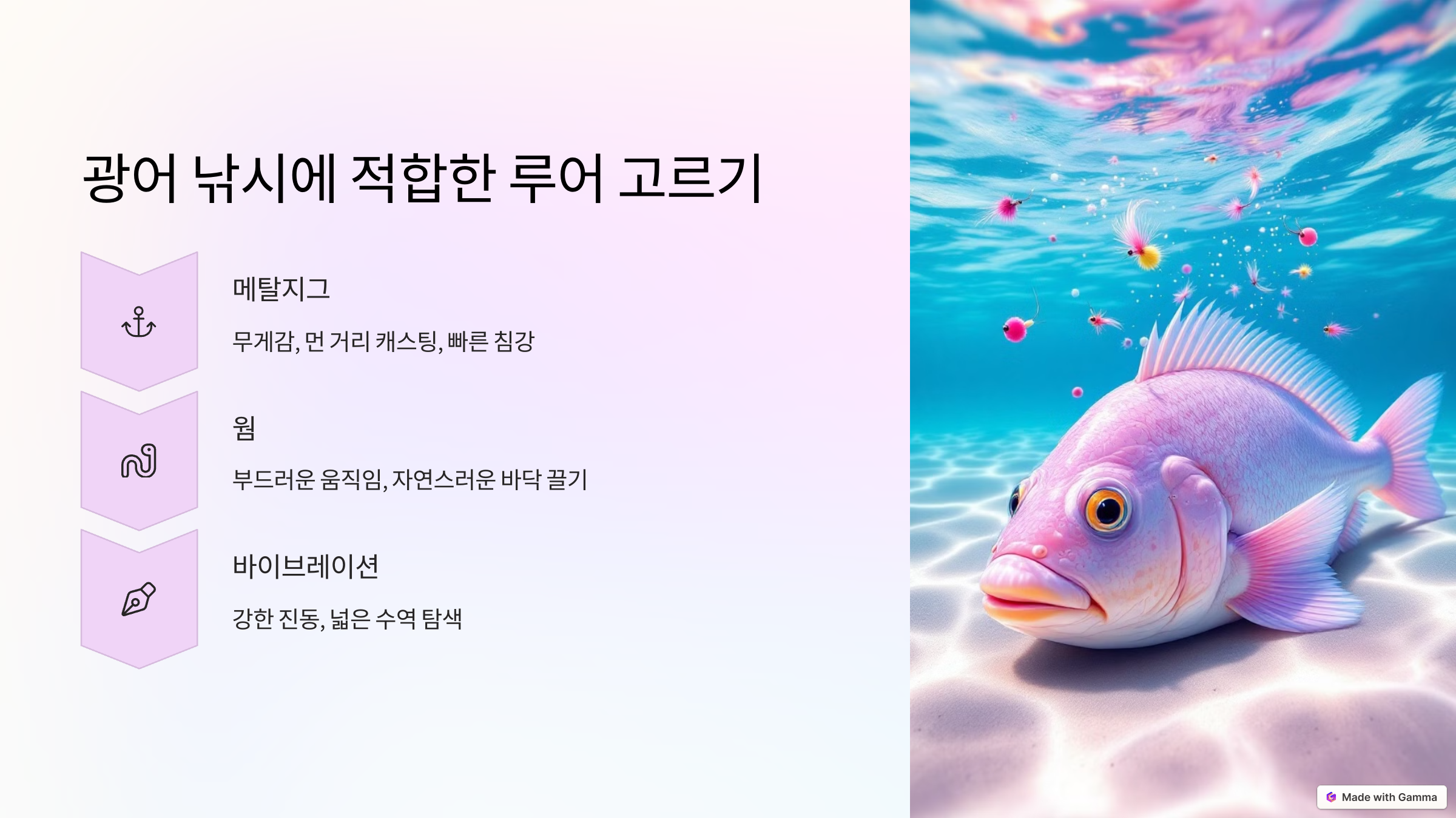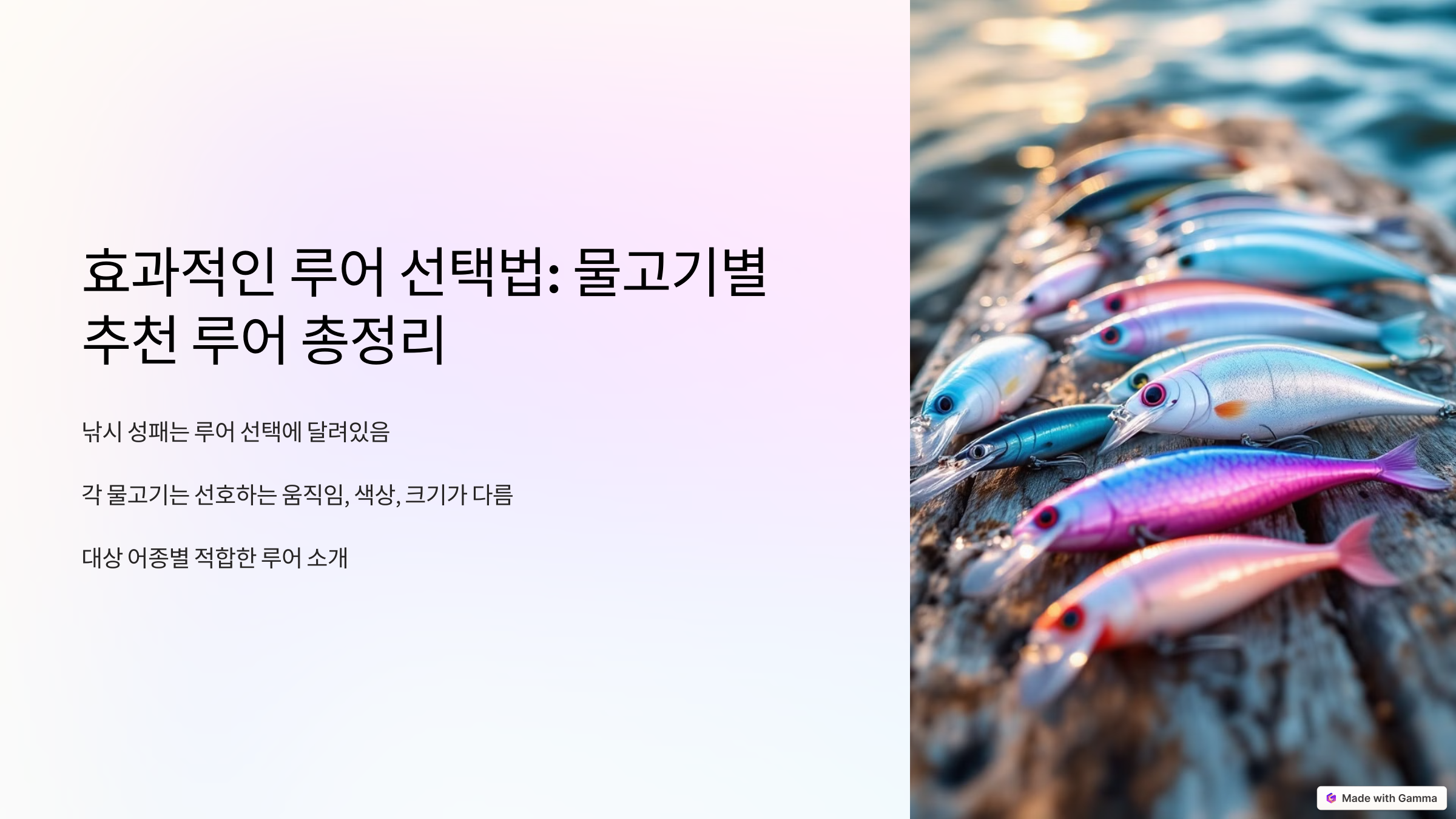 물고기마다 생태와 반응하는 자극이 다르기 때문에, 루어 선택은 어종별로 세심하게 접근해야 합니다. 배스는 강한 액션과 다양한 수심 공략이 가능한 루어가, 광어는 바닥층에 적합한 무게감 있는 루어가, 송어는 자연스럽고 섬세한 움직임이 특징인 루어가 효과적입니다. 현장 상황에 맞는 루어를 선택하고, 계속된 실전 경험을 통해 자신만의 노하우를 쌓아가시길 바랍니다!